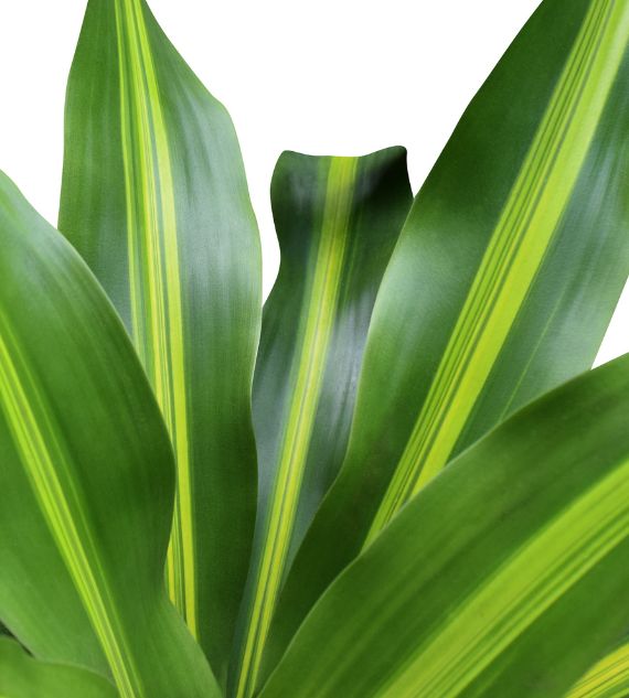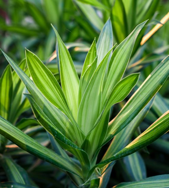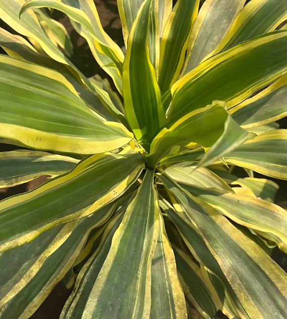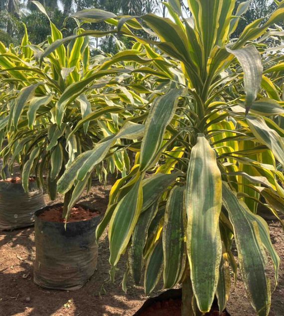 Dragon Lily with Dracaena fragrans 'Victoriae' combines the dramatic, sword-like variegated leaves of 'Victoriae' with a compact, upright form. Its creamy white and green striped foliage adds a bold, architectural element to indoor spaces, thriving in bright, indirect light with minimal care.