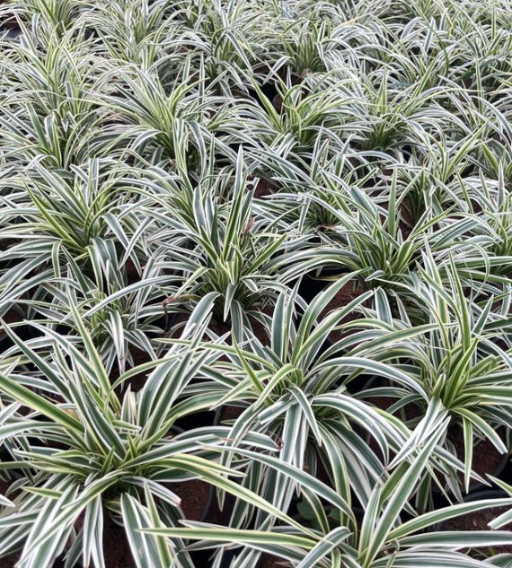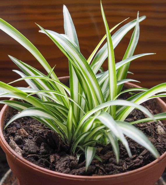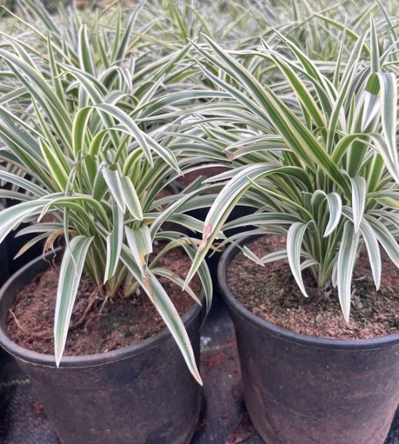 Variegated Spider Plant (Chlorophytum comosum) is a popular indoor plant known for its arching green leaves with white stripes. Easy to grow and low-maintenance, it thrives in indirect light and helps purify indoor air. The plant produces small white flowers and baby “spiderettes,” making it both decorative and beneficial for home or office environments.
