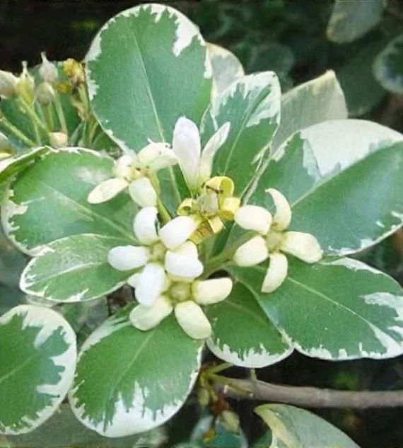 Variegated Pittosporum Tobira is an ornamental shrub with creamy-white and green foliage and fragrant white flowers. It’s perfect for hedges or landscape accents and thrives in full sun to partial shade.