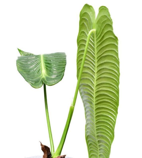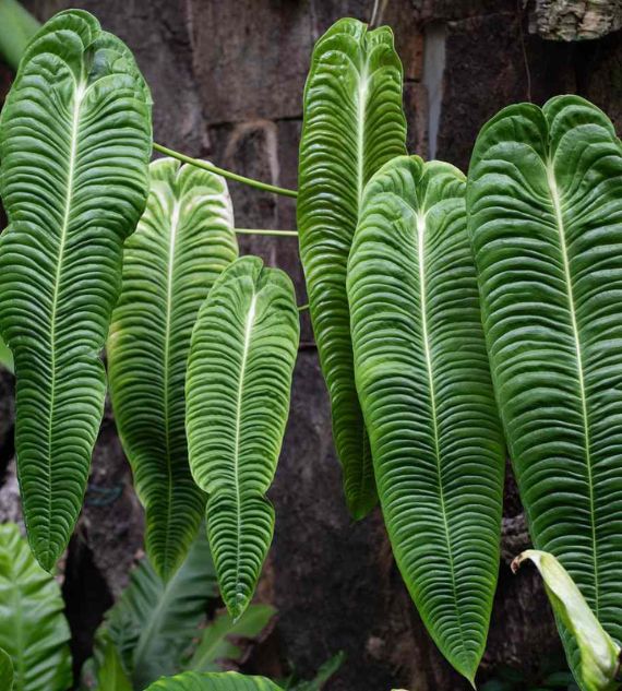 Anthurium Veitchii, also known as the King Anthurium, is a striking tropical plant with large, elongated, deeply ribbed leaves. It thrives in humid, warm environments and adds a bold, exotic touch to interiors or greenhouses.