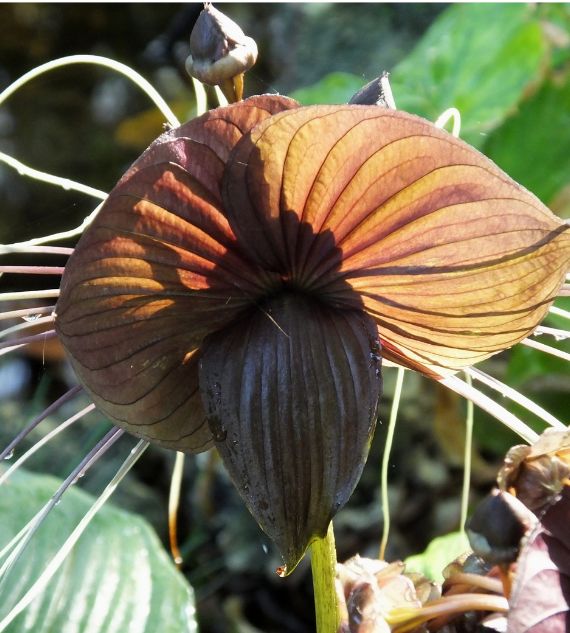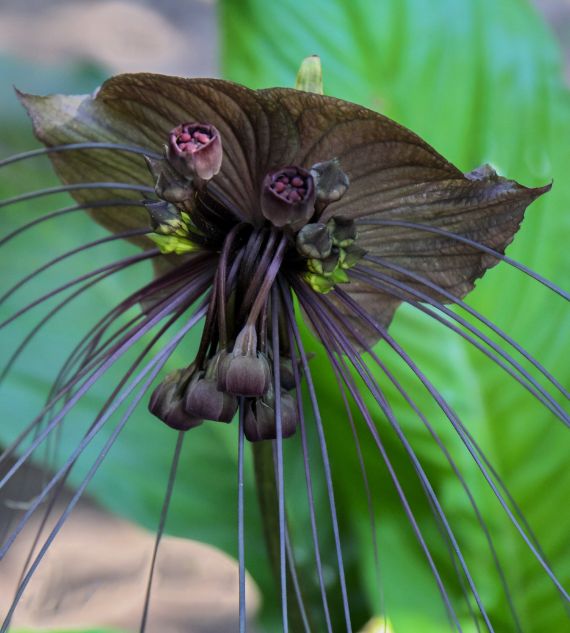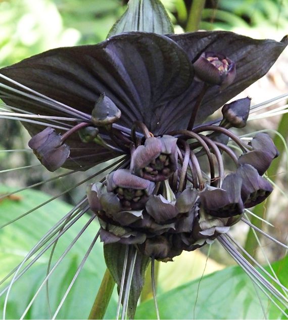 Tacca chantrieri, commonly known as Bat Flower or Devil Flower, is an exotic tropical plant with striking black or deep purple flowers resembling a bat in flight, complete with long whisker-like bracts. It's prized for its dramatic appearance and thrives in warm, humid environments.