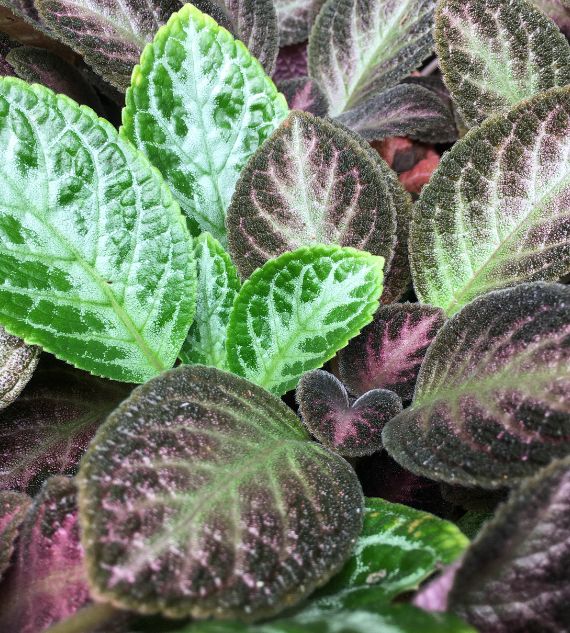 Episcia varieties like Lilacina, Brown, Costa Rica, and Blue Flowered Teddy-bear are known for their velvety, colorful foliage ranging from green to bronze, and vibrant flowers in shades of lilac, red, and blue. These trailing plants thrive in warm, humid, and shaded indoor settings, making them perfect for hanging baskets or tabletop displays.