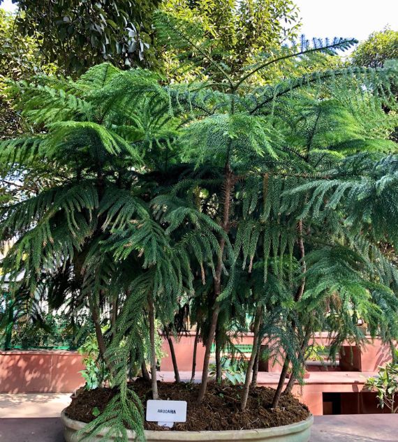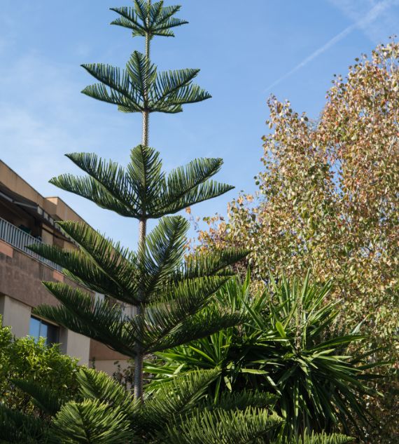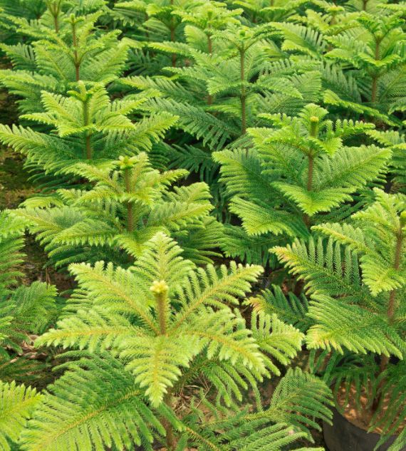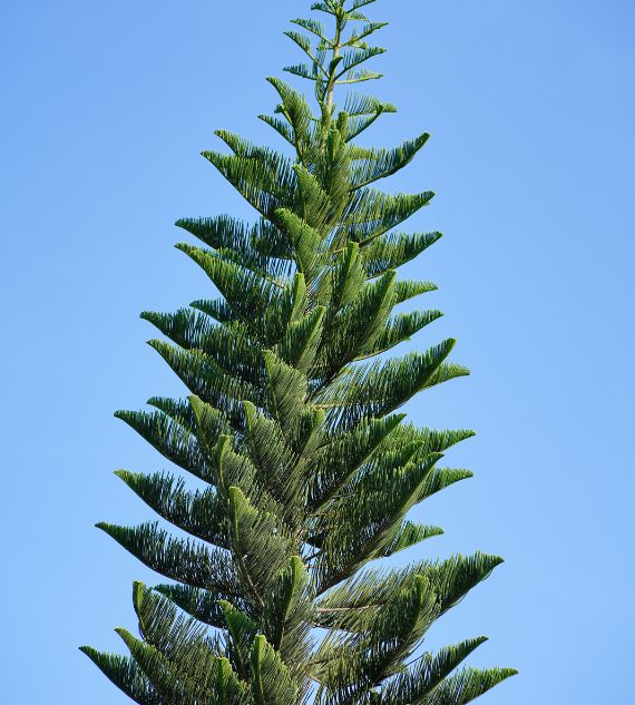 The Araucaria columnaris, commonly known as the Christmas Tree or Cook Pine, is a tall, slender, evergreen tree with symmetrical, whorled branches and needle-like leaves. It is often used as a decorative tree during Christmas and is valued for its elegant, conical shape and year-round greenery.