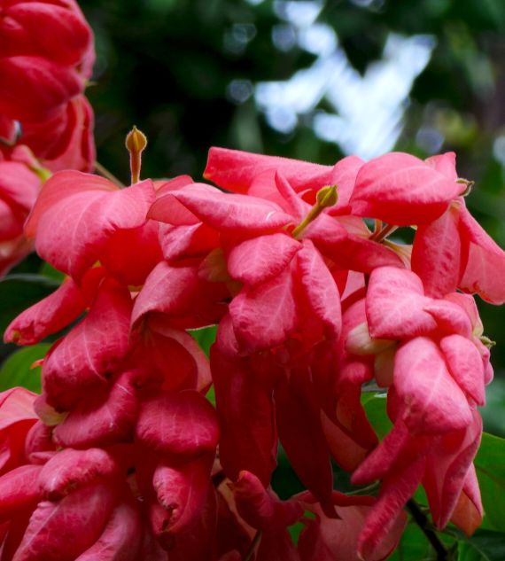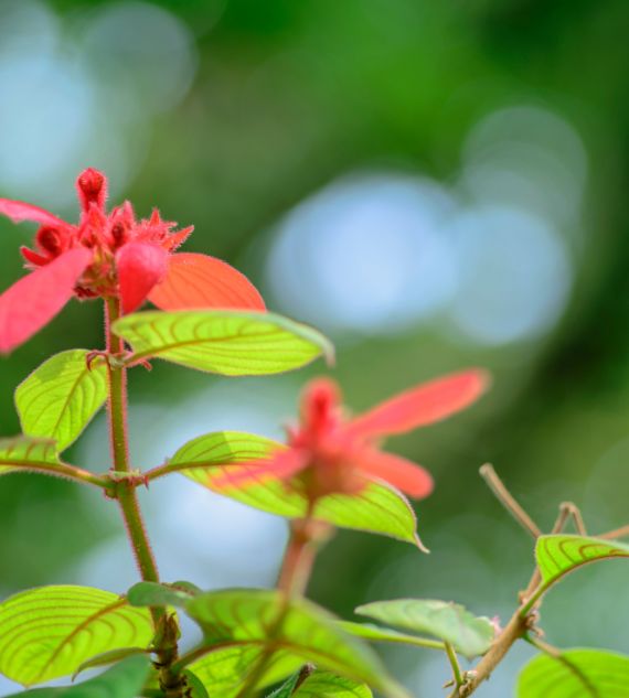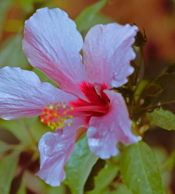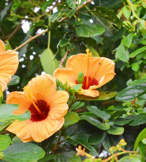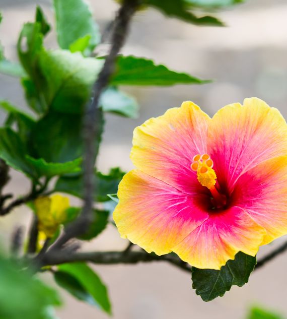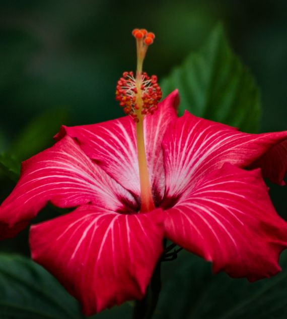 The Hibiscus rosa-sinensis is a tropical, evergreen shrub known for its large, vibrant, trumpet-shaped flowers that come in various colors like red, pink, orange, and yellow. It's commonly used in landscaping for its ornamental beauty and is also the national flower of Malaysia.