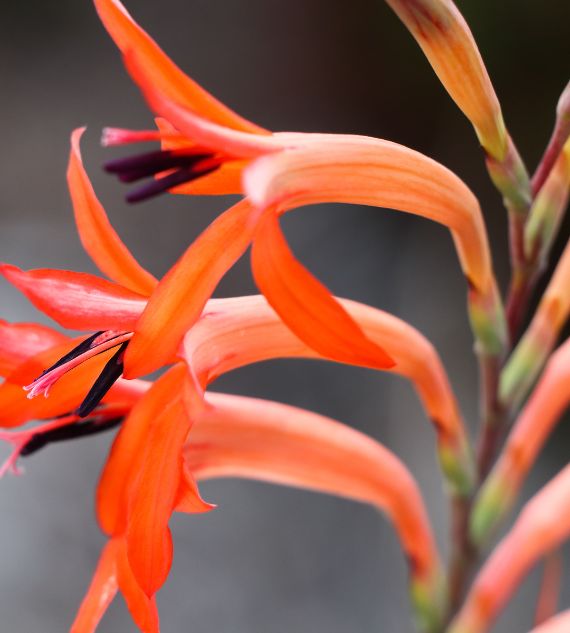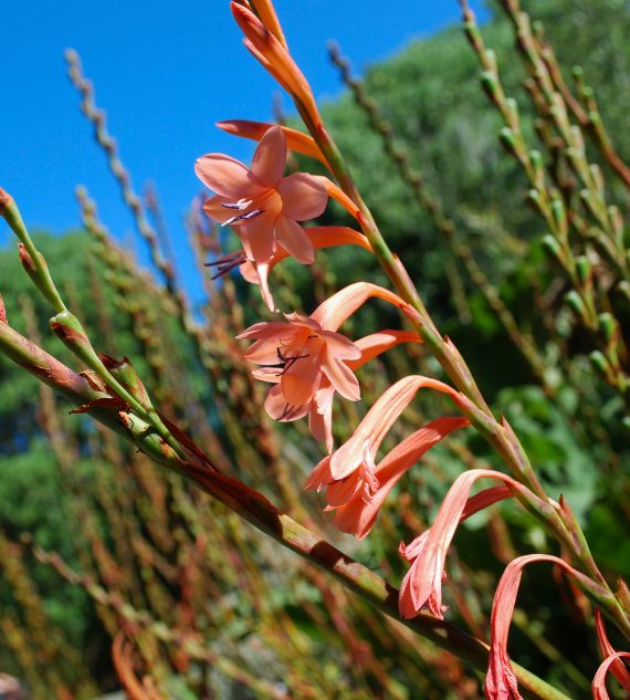 Watsonia meriana, also known as Wild Bugle Lily or Wild Watsonia, is a flowering plant native to South Africa. It features tall spikes of tubular, pink to red flowers and is often found in open grasslands. The variety W. meriana var. bulbillifera (or W. bulbillifera) is notable for producing bulbils, which aid in its rapid spread, making it an invasive species in some regions.