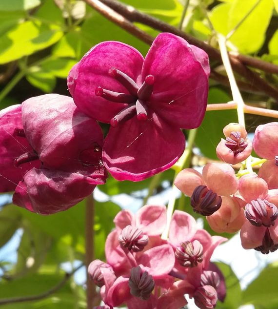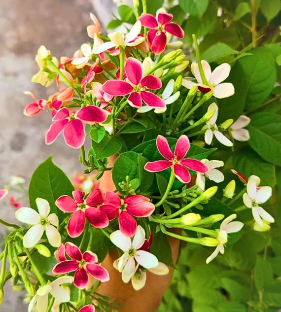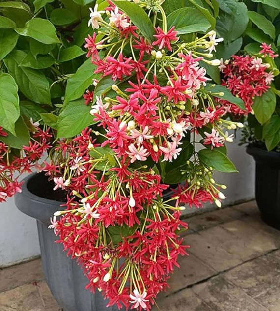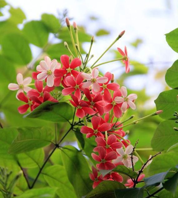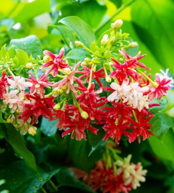 Madhumalati, also known as Rangoon Creeper (Quisqualis indica), is a fast-growing, flowering vine native to tropical Asia. It features striking, fragrant flowers that change color from white to pink to red as they mature. It's also known for its traditional medicinal uses.