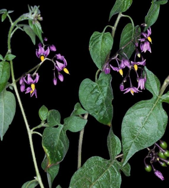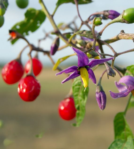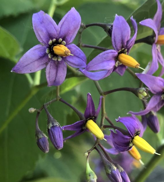 Climbing Nightshade (Solanum dulcamara), also known as Bittersweet Nightshade, is a semi-woody vine native to Europe and Asia but found in many parts of the world. It produces clusters of small, star-shaped purple flowers with yellow centers and bright red berries. While attractive, it is toxic if ingested.