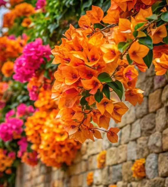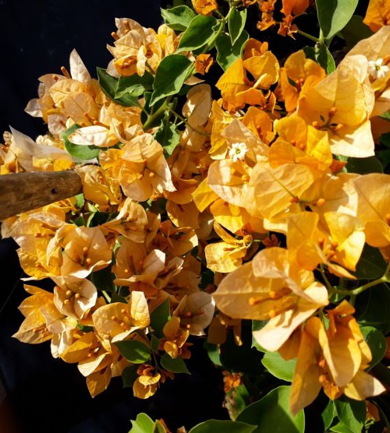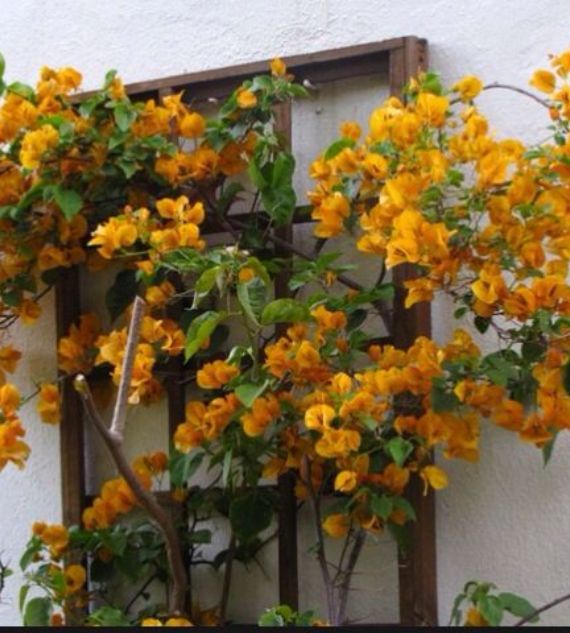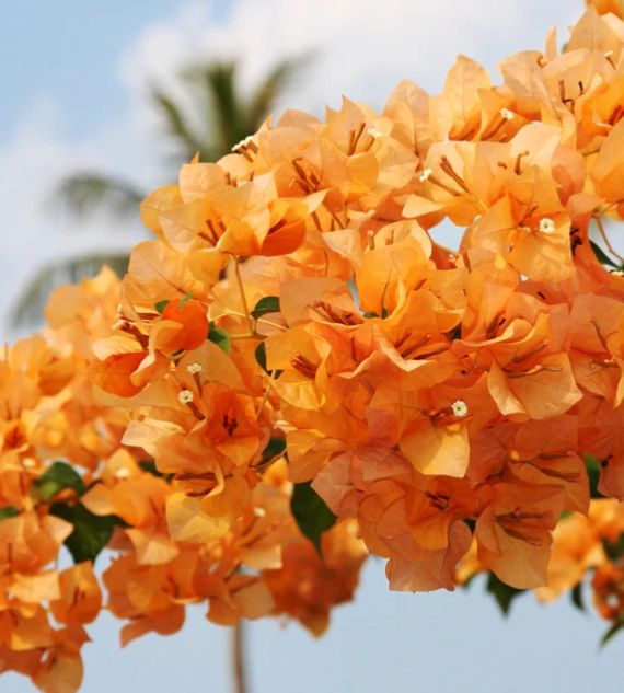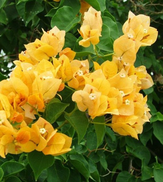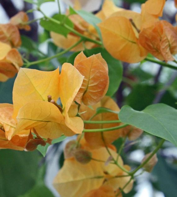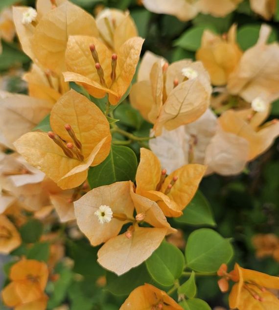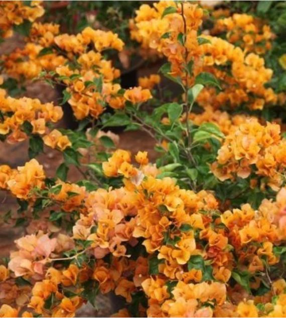 Bougainvillea 'Buttiana Blondie Yellow Orange' is a vibrant tropical climber known for its striking yellow-orange bracts that bloom profusely from spring through autumn. This evergreen vine thrives in full sun and well-drained soil, making it ideal for adding a splash of color to fences, trellises, and garden walls.