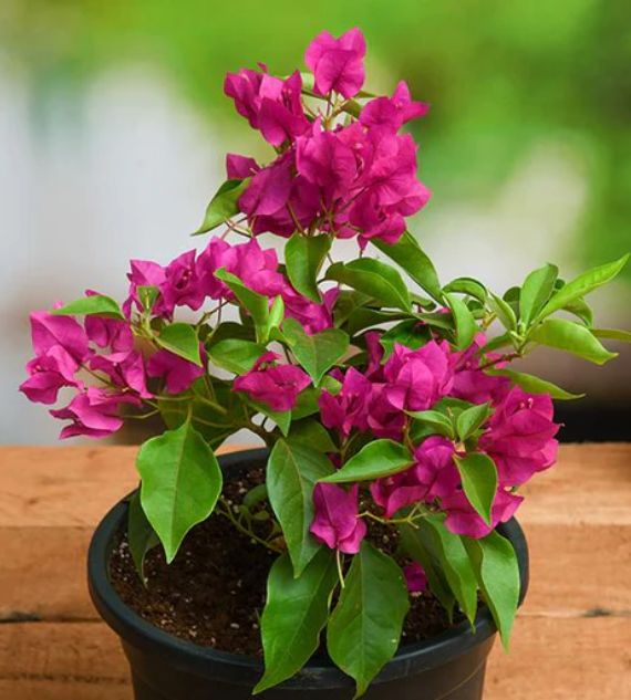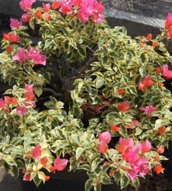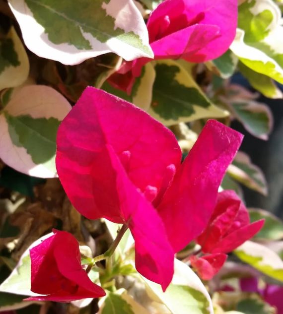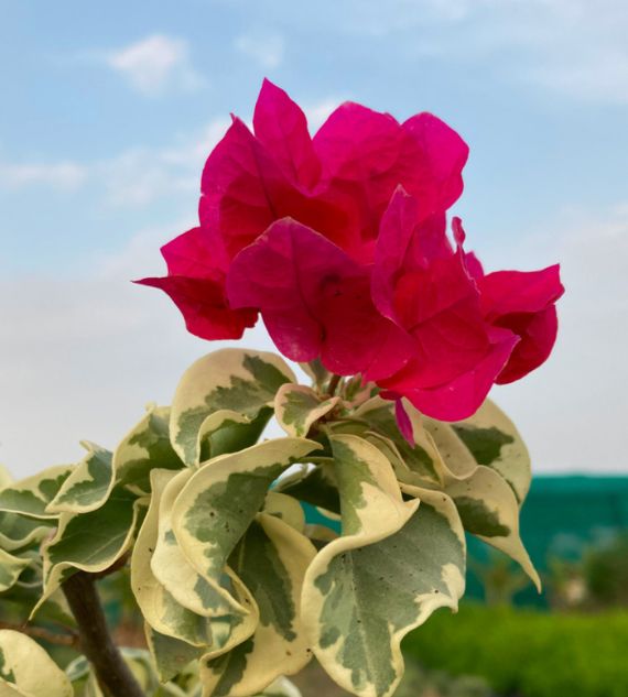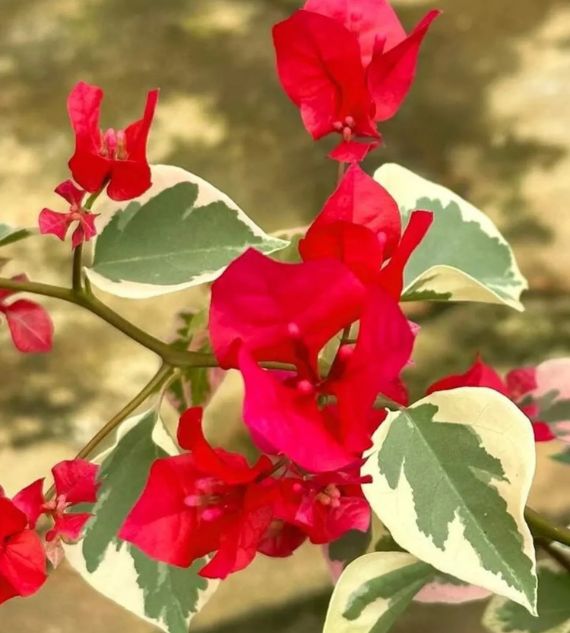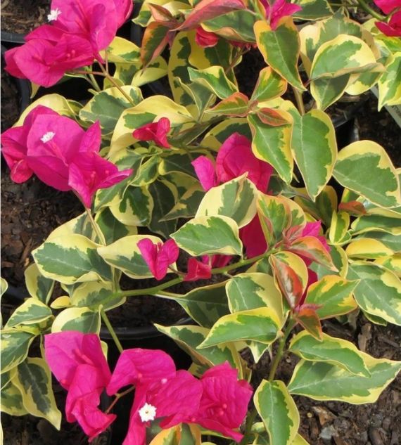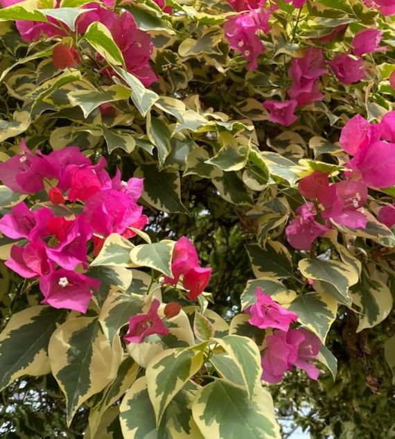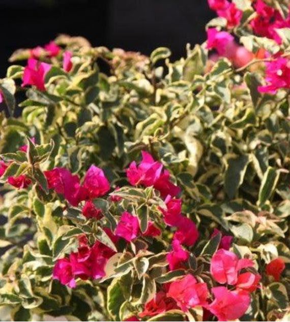 Bougainvillea Spectabilis Hong Kong Red Variegated features striking red bracts with beautiful green and white variegated leaves, making it a vibrant and decorative climber. Raspberry Variegated showcases raspberry-pink flowers paired with creamy-edged variegated foliage, adding lively color and texture to gardens. Both thrive in full sun and are perfect for trellises and fences.