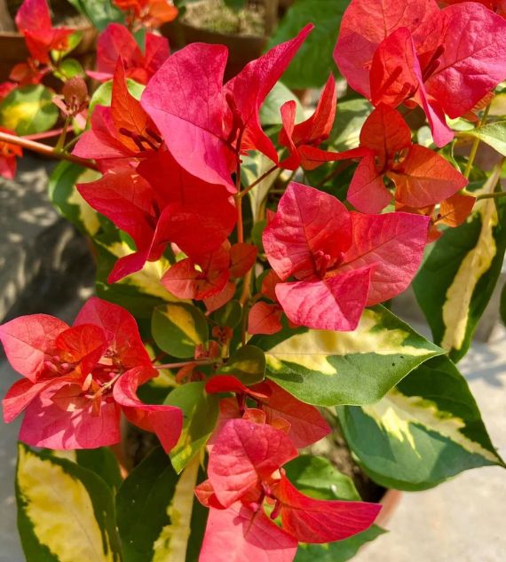 Bougainvillea 'Buttiana Jackie Rana Variegata' is a vibrant climbing plant featuring variegated green and white leaves and striking salmon-orange bracts. This hardy, evergreen vine thrives in full sun and well-drained soil, making it ideal for trellises, fences, or large containers.