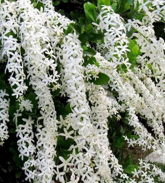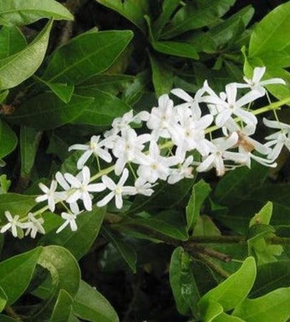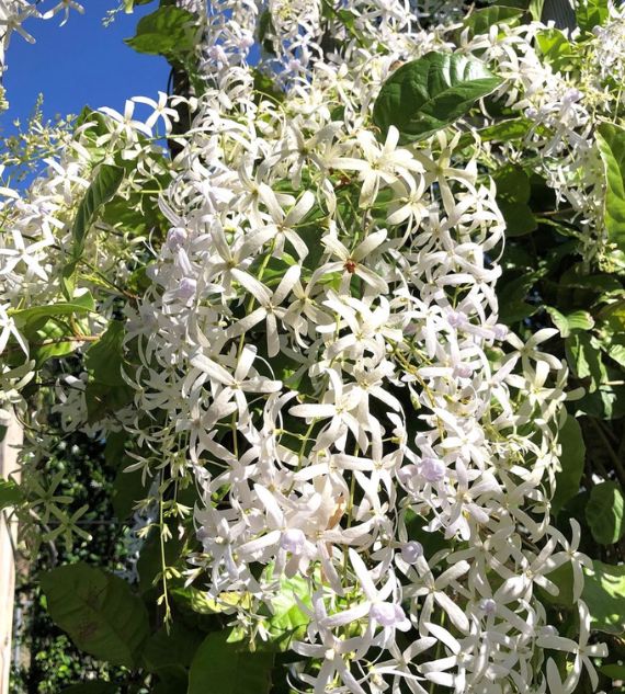 Petrea volubilis 'Albiflora' is a stunning climbing plant known for its cascading clusters of star-shaped white flowers and rough-textured green leaves. This white-flowering variety of the Queen’s Wreath adds elegance to trellises and pergolas, blooming profusely in warm, sunny conditions.