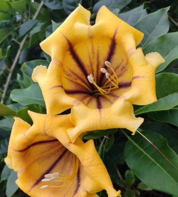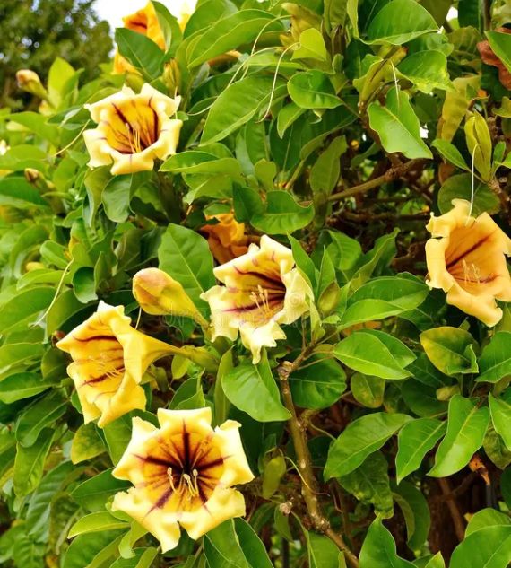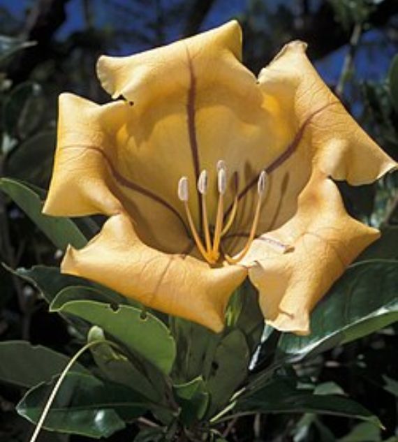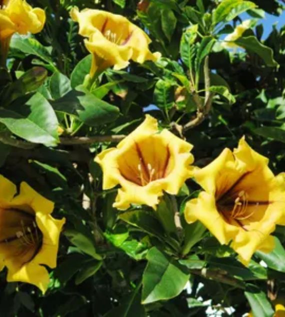 Solandra nitida, commonly known as the Cup of Gold or Chalice Vine, is a vigorous tropical climber with large, glossy green leaves and spectacular golden-yellow, chalice-shaped flowers. Known for its sweet fragrance, it thrives in warm climates and makes a stunning statement on trellises, walls, or pergolas.