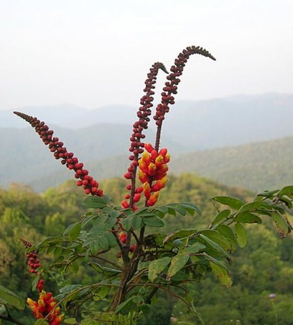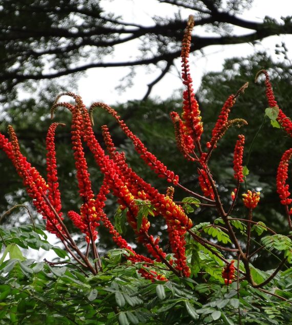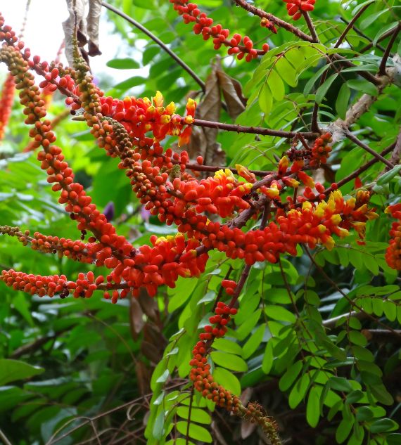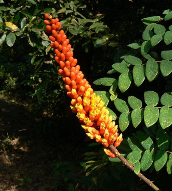 Spiky Blooms such as Caesalpinia, Moullava, Wagatea, and the Candy Corn Plant are ornamental climbers or shrubs known for their striking, spiky-shaped flowers in vivid colors like red, orange, and yellow. These eye-catching plants add bold texture and tropical flair to garden landscapes.