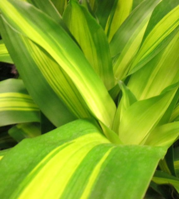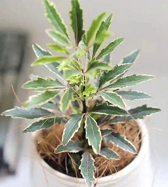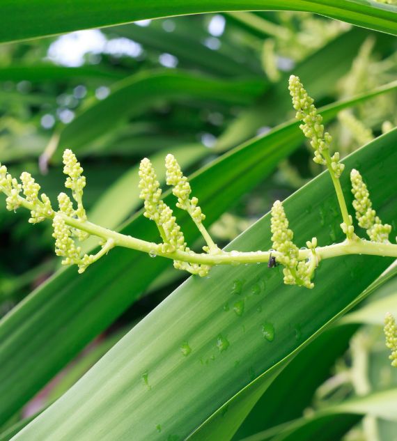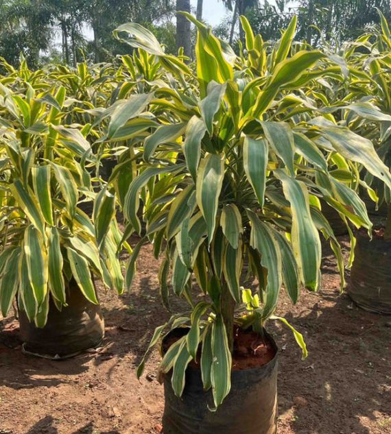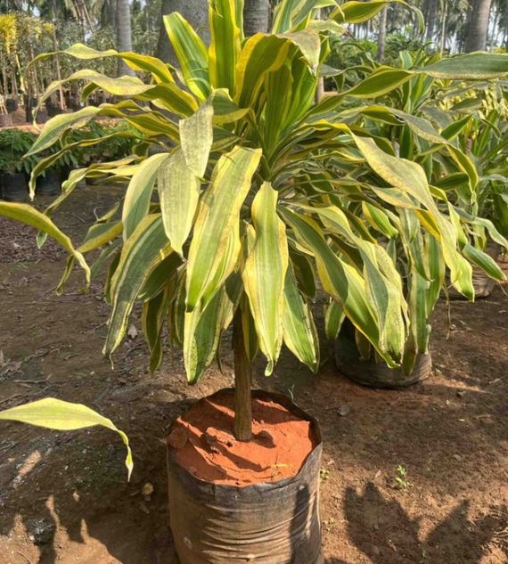 Dragon Lily with Dracaena fragrans 'Victoriae' combines the dramatic, sword-like variegated leaves of 'Victoriae' with a compact, upright form. Its creamy white and green striped foliage adds a bold, architectural element to indoor spaces, thriving in bright, indirect light with minimal care.