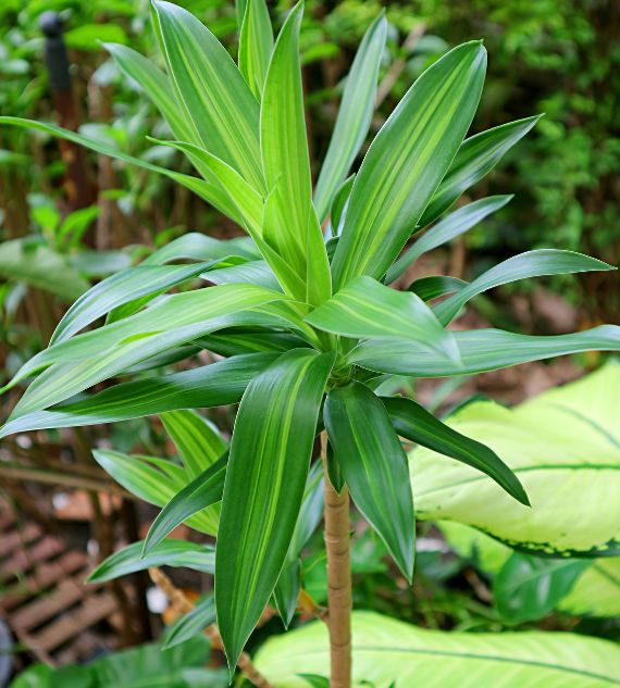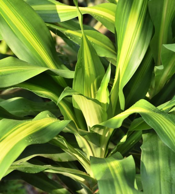 Dracaena fragrans 'Massangeana', commonly known as the Cornstalk Plant, features long green leaves with a central yellow stripe, resembling corn foliage. It's a popular, air-purifying houseplant that thrives in low to bright indirect light and requires minimal maintenance.