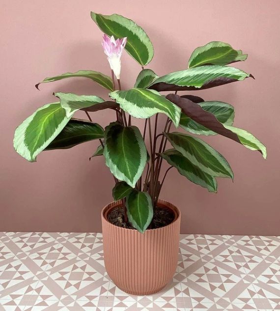 Calathea Bicajoux Pink is a stunning indoor plant admired for its lush green foliage and delicate pink blooms. Its broad, patterned leaves with subtle textures add elegance to any space. This plant thrives in indirect light and humid conditions, making it perfect for indoor environments. Known for its decorative appeal, it also contributes to cleaner indoor air.