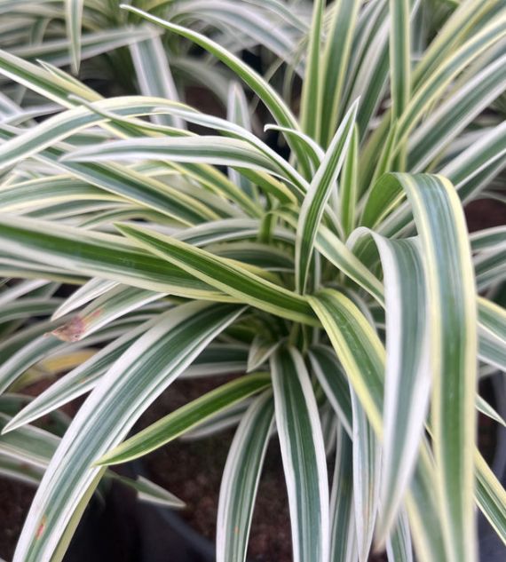 Variegated Spider Plant (Chlorophytum comosum) is a popular indoor plant known for its arching green leaves with white stripes. Easy to grow and low-maintenance, it thrives in indirect light and helps purify indoor air. The plant produces small white flowers and baby “spiderettes,” making it both decorative and beneficial for home or office environments.