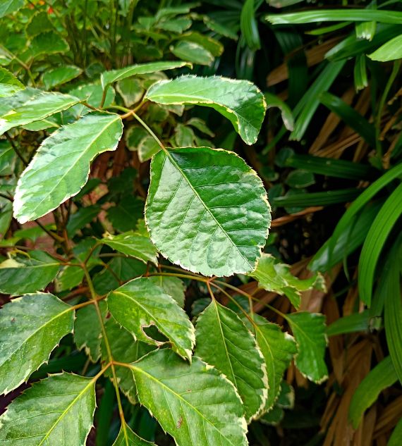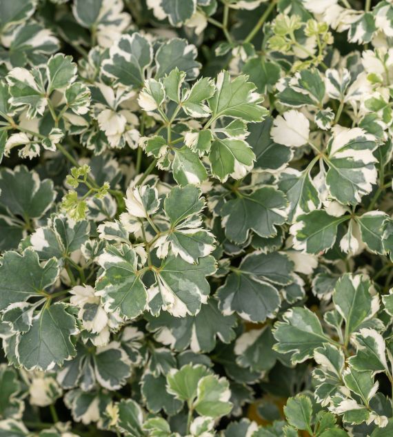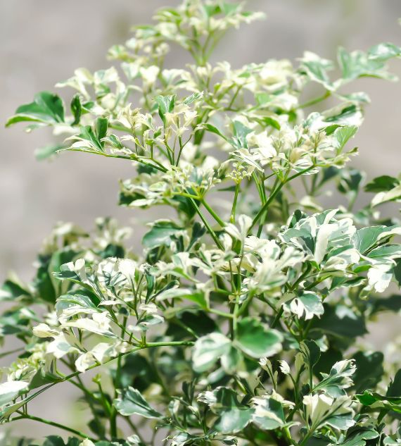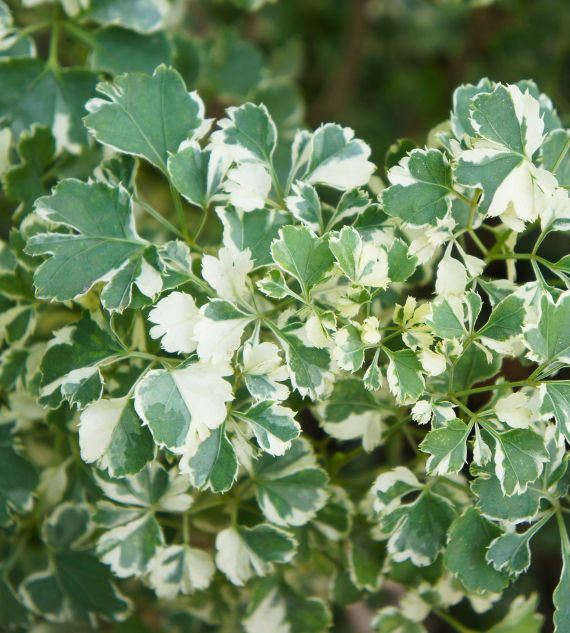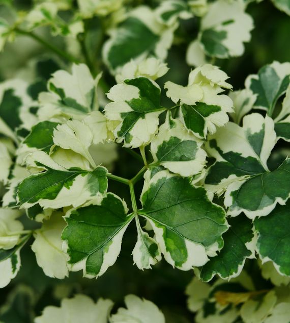 Polyscias guilfoylei 'Victoriae', also known as Lace Leaf Aralia Variegated or Aralia White, features finely cut, lacy green leaves with creamy-white variegation. This elegant, upright plant thrives in bright, indirect light and adds a soft, decorative touch to indoor or shaded garden spaces.