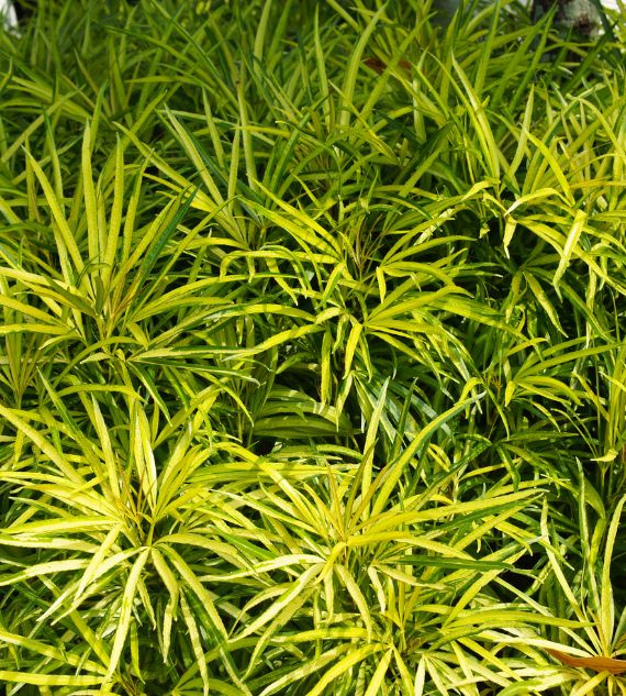 Glowing Yellow Osmoxylon lineare 'Aureum', also known as Golden Finger Aralia, is a vibrant ornamental shrub with slender, finger-like leaves in striking yellow-green hues. Perfect for brightening up gardens or patios, it grows well in partial shade and adds a lush, tropical feel to any landscape.