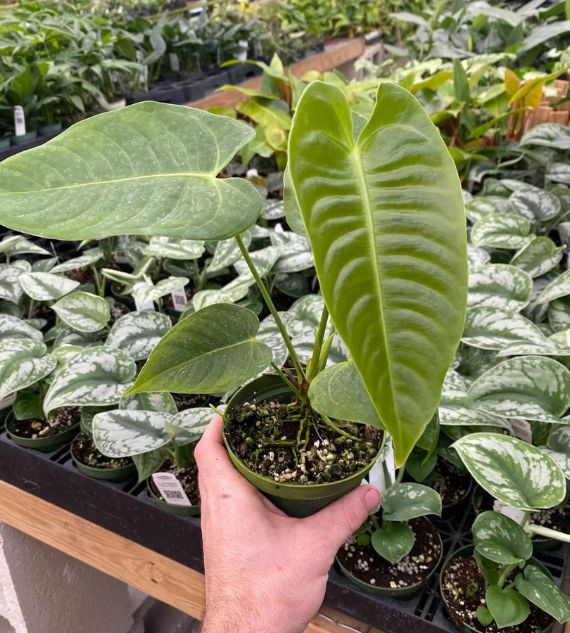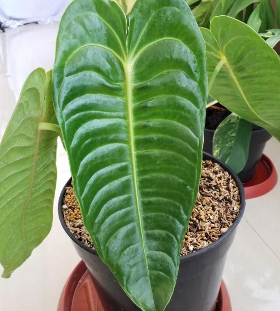 Anthurium Veitchii, also known as the King Anthurium, is a striking tropical plant with large, elongated, deeply ribbed leaves. It thrives in humid, warm environments and adds a bold, exotic touch to interiors or greenhouses.