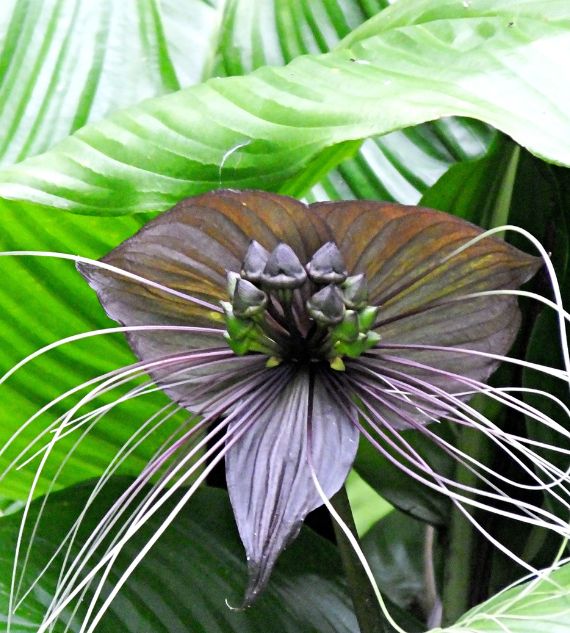 Tacca chantrieri, commonly known as Bat Flower or Devil Flower, is an exotic tropical plant with striking black or deep purple flowers resembling a bat in flight, complete with long whisker-like bracts. It's prized for its dramatic appearance and thrives in warm, humid environments.