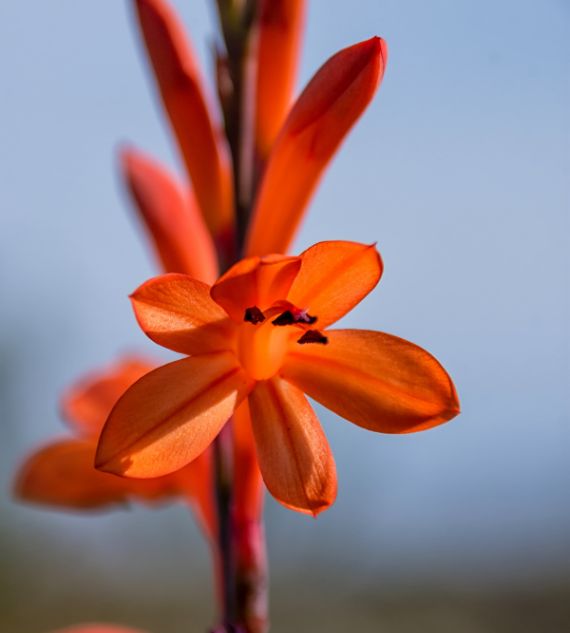 Watsonia meriana, also known as Wild Bugle Lily or Wild Watsonia, is a flowering plant native to South Africa. It features tall spikes of tubular, pink to red flowers and is often found in open grasslands. The variety W. meriana var. bulbillifera (or W. bulbillifera) is notable for producing bulbils, which aid in its rapid spread, making it an invasive species in some regions.
